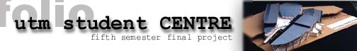 UTM Students Centre is the major project held in the fifth semester under the Energy CAD workbase. Done entirely using AutoCAD and 3D Studio MAX programs, this energy concious building design consists of four major spaces, the administration office, fastfood restaurant & retails, seminar building and student centre. Proposed to be built within the UTM's area itself, the centre is a combination of free standing, unique forms of buildings, taking aspects of enviromental friendly and context with site. The structure of admin office building was taken from a building designed by Nicholas Grimshaw, using giant structure of steel columns supporting the roof. |
